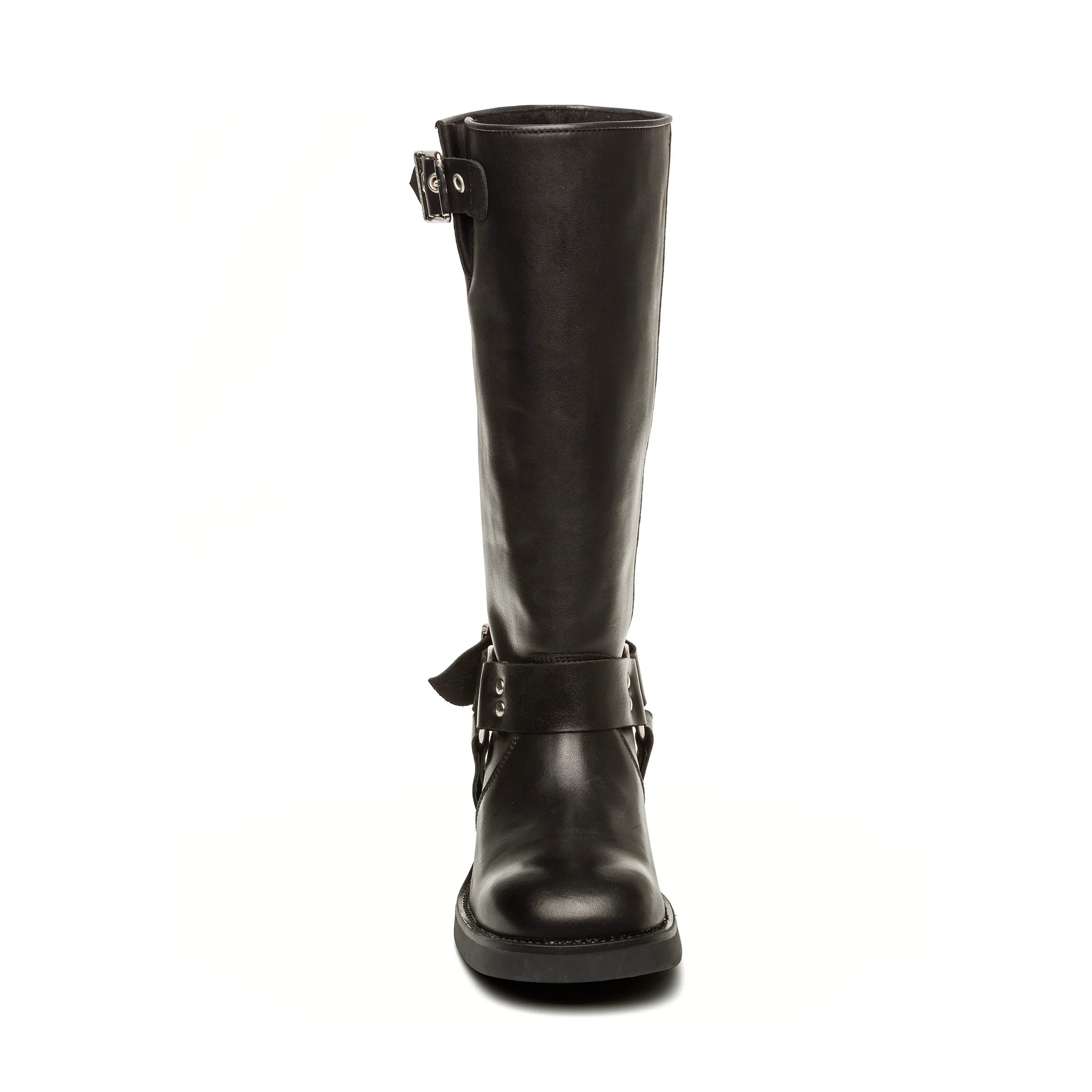 Der BEAU Stiefel mit runder Spitze hat eine schlanke Silhouette in der Mitte der Wade, die durch Riemenakzente und eine Schnalle Hardware. Eine breite Sohle mit Blockabsatz bietet eine solide Grundlage für dieses von Ingenieuren inspirierte Design.